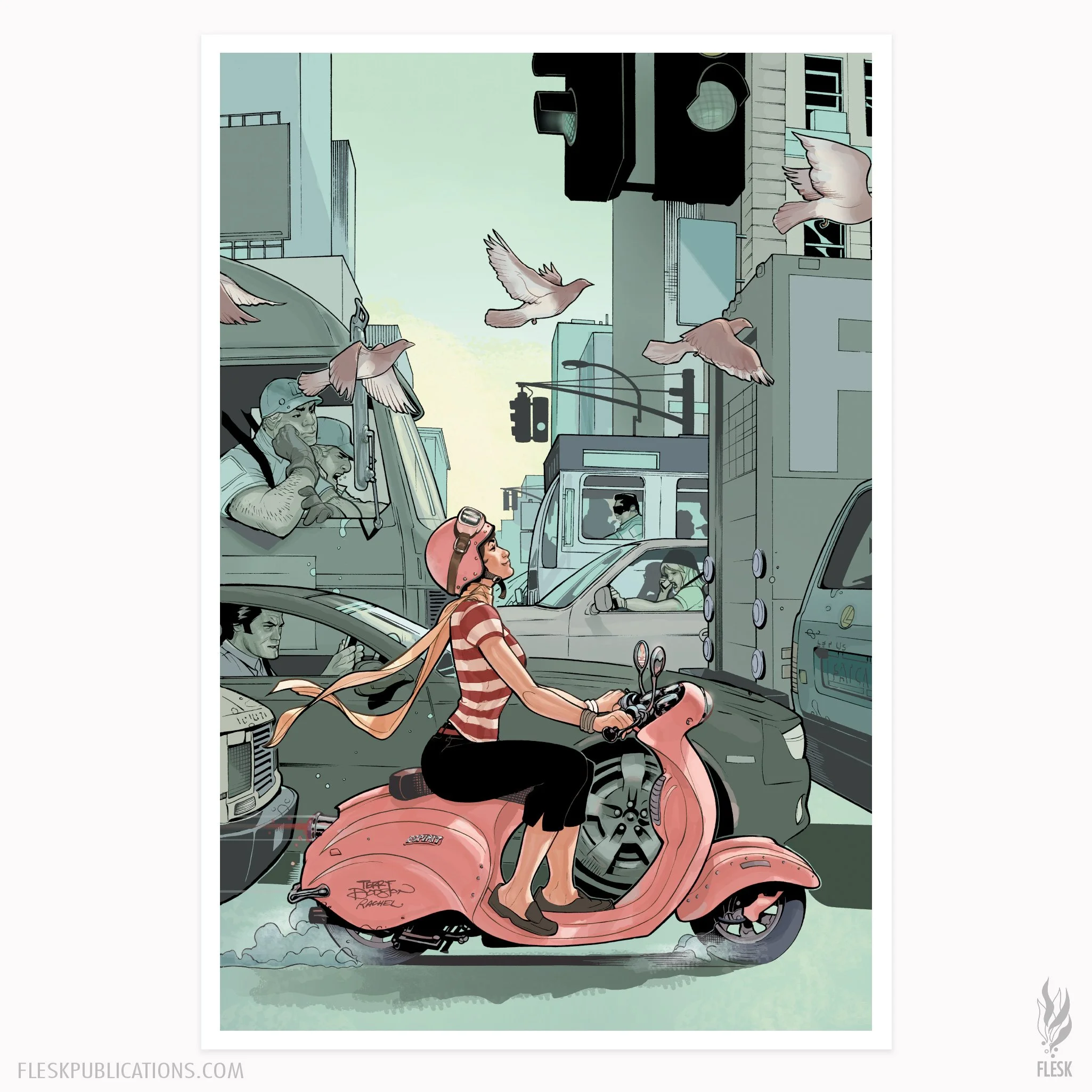Signed premium quality print featuring Terry and Rachel Dodson's “Scooter.” This luxurious 18 x 24" print utilizes 300 gsm acid free matte paper that is printed with archival inks. This print is signed in pencil by Terry and Rachel Dodson and comes with a custom-made embossing of their initials.