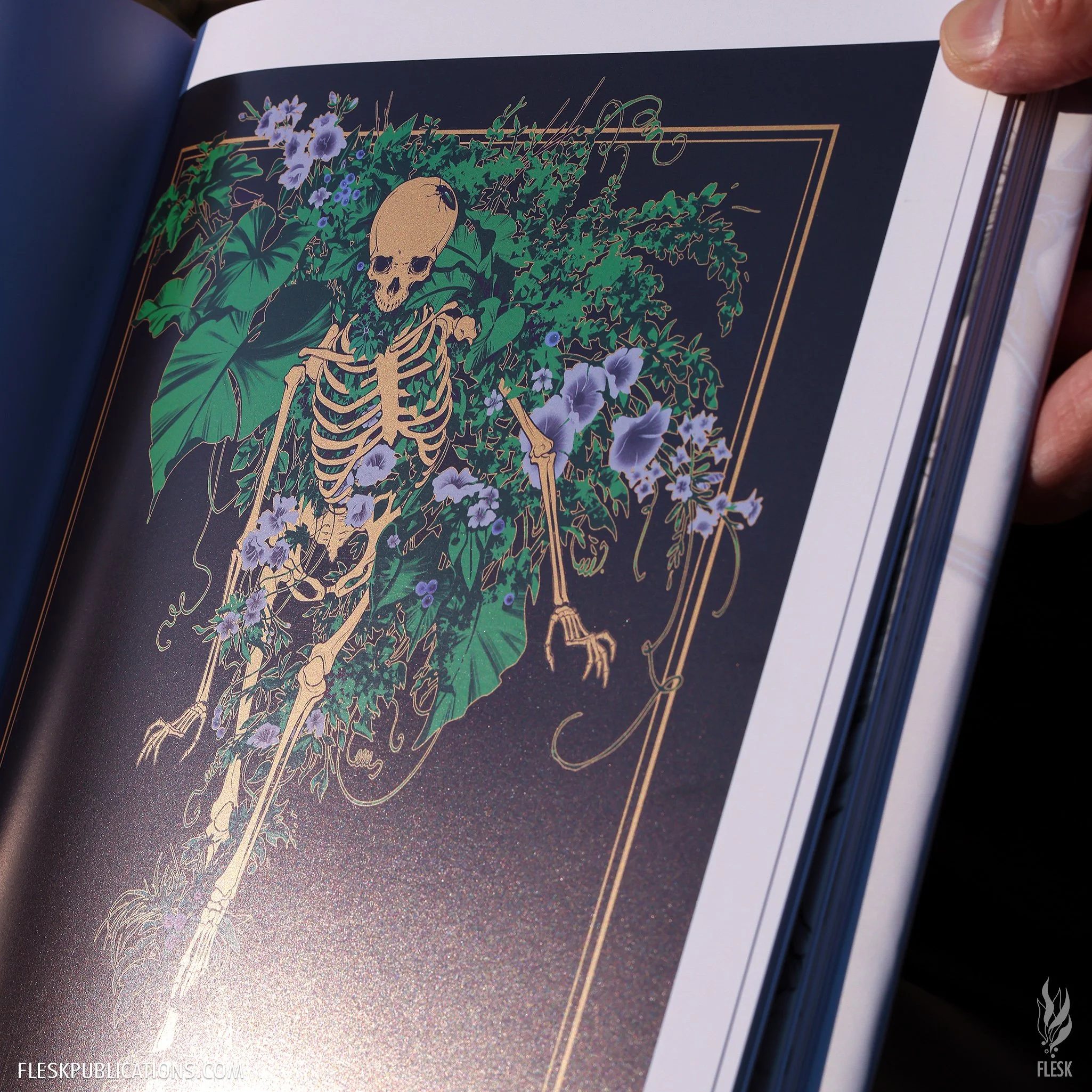 -Boards feature blind stamp of skeleton line art